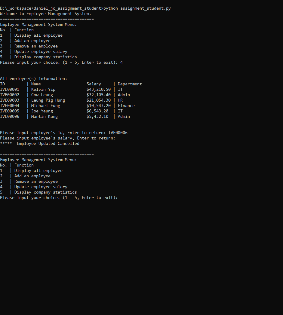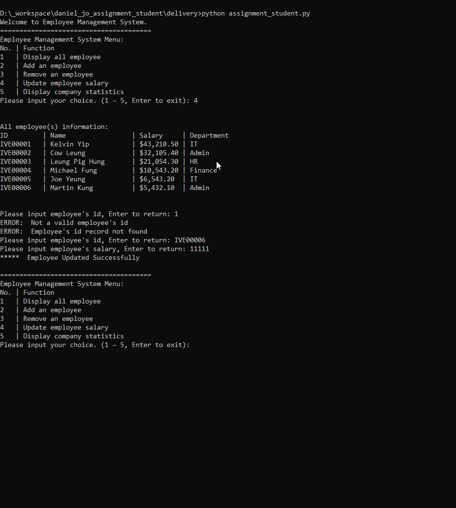 3. after getting valid salary, show "* Employee Updated Successfully" to user