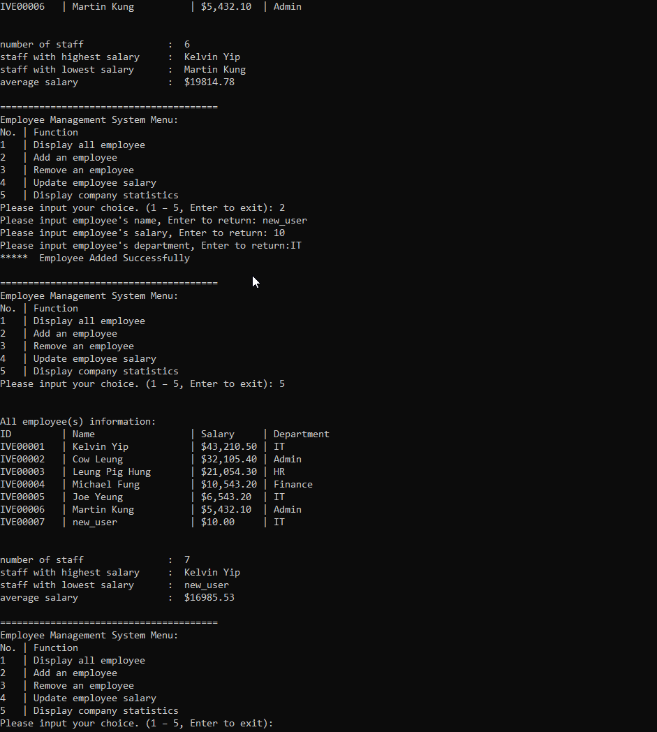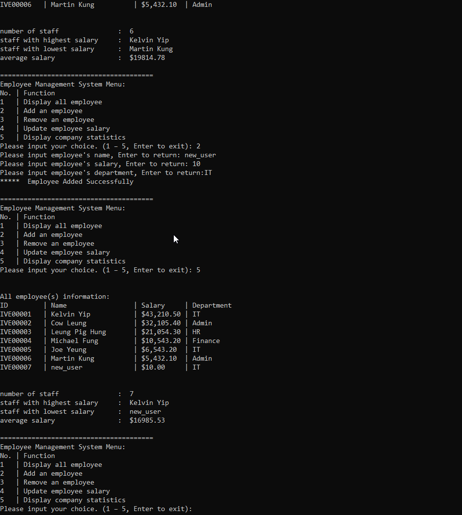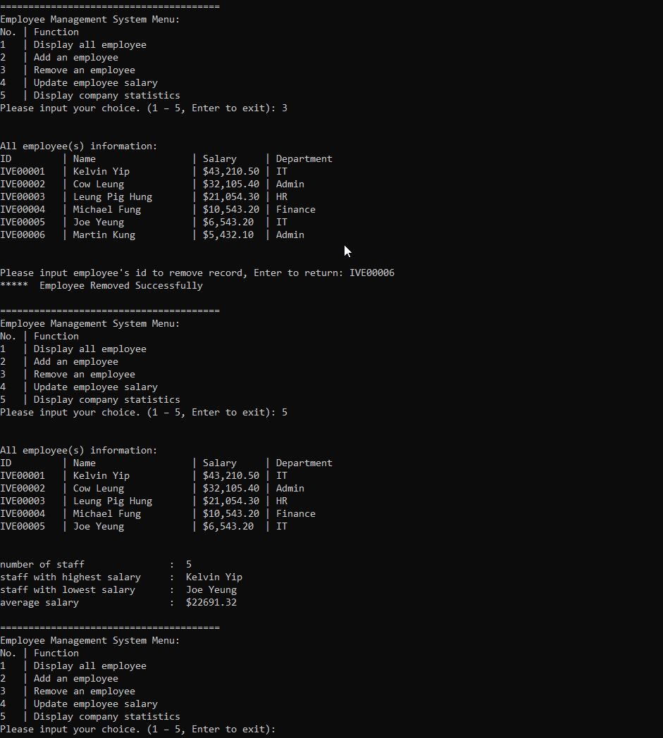 23 update average after remove user 1. In the employee management system menu, input '5' get current snap of employee table