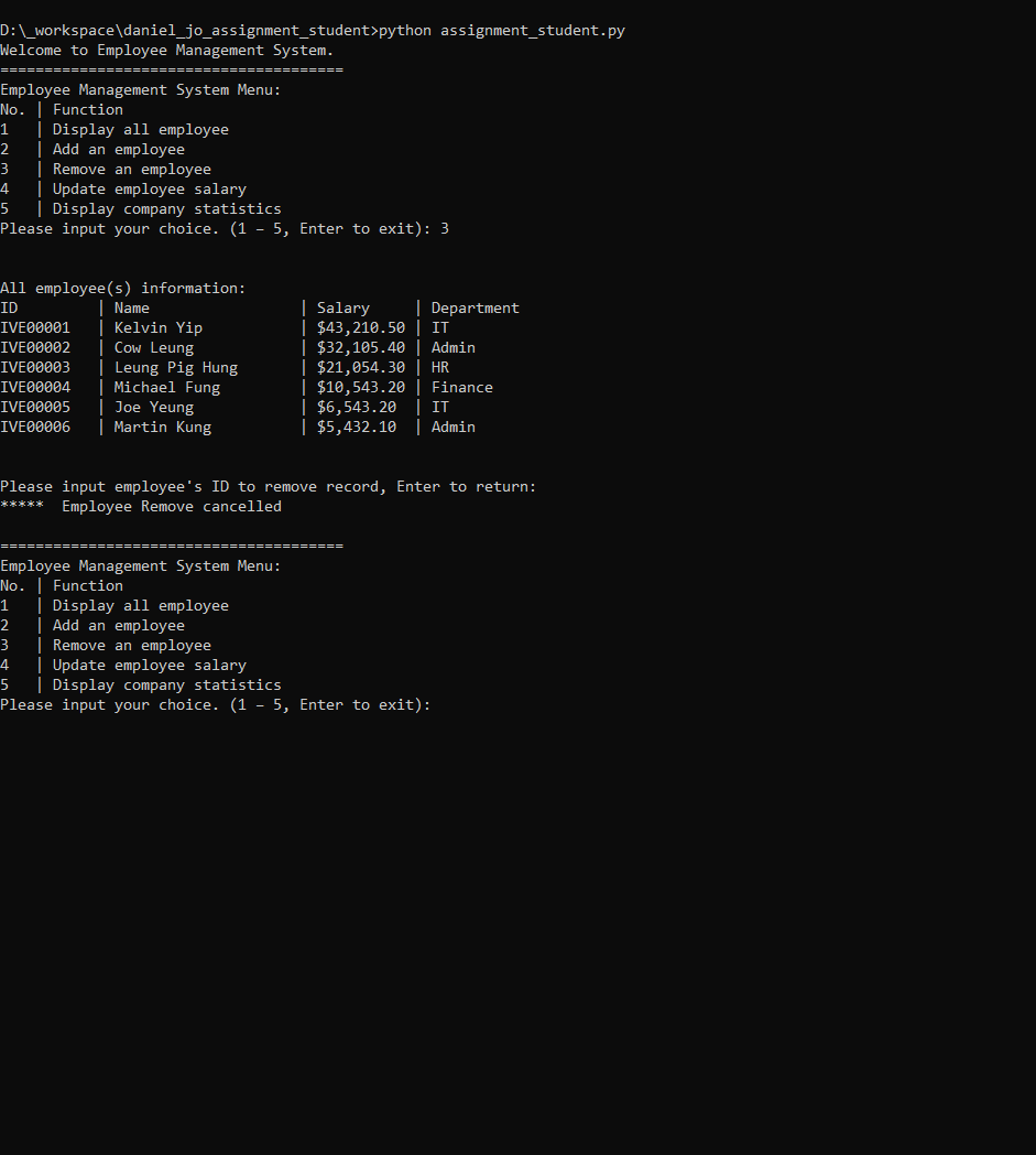 27 remove employee (cancelling) 1. In the employee management system menu, input '3' to remove an employee