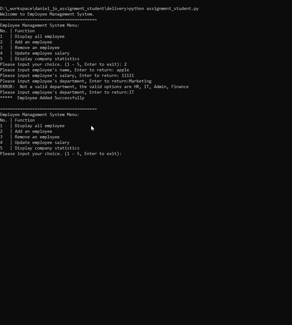 3. after getting valid department, show "* Employee Added Successfully"