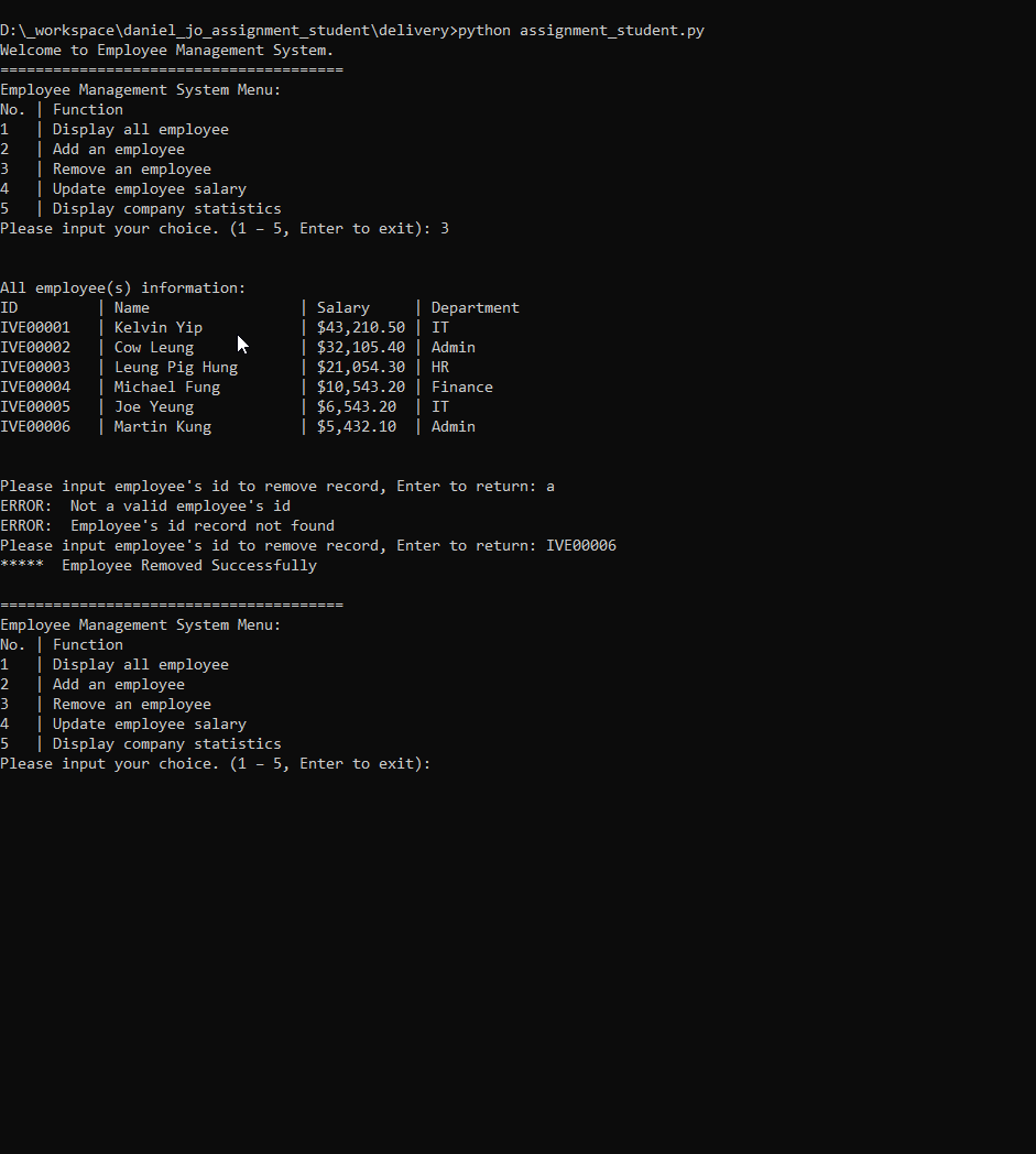 3. after getting valid id, show "* Employee Removed Successfully"