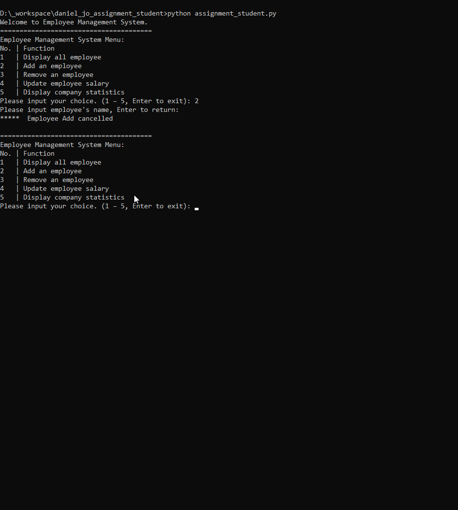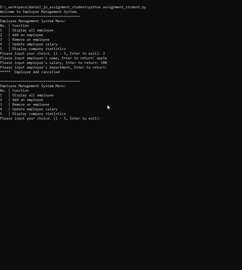 25 add employee (cancelling) 1. In the employee management system menu, input '2' to add an employee