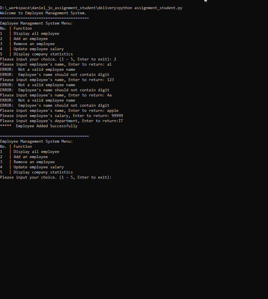 3. Input "aaaaa" for salary (invalid input as contains text)