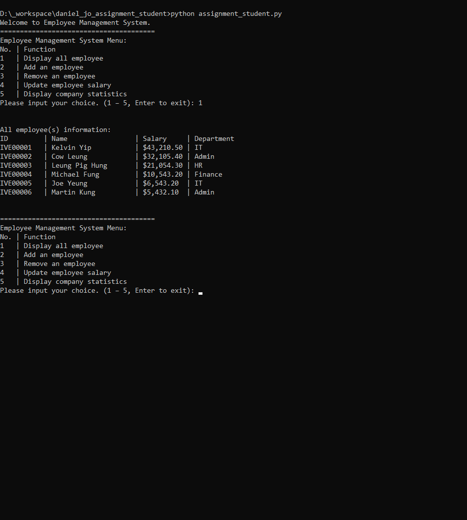 2 Add an employee with name "Pika Chiu, salary 15000 and wortks in IT department into the system 1. In the employee management system menu, input '2' to add an employee