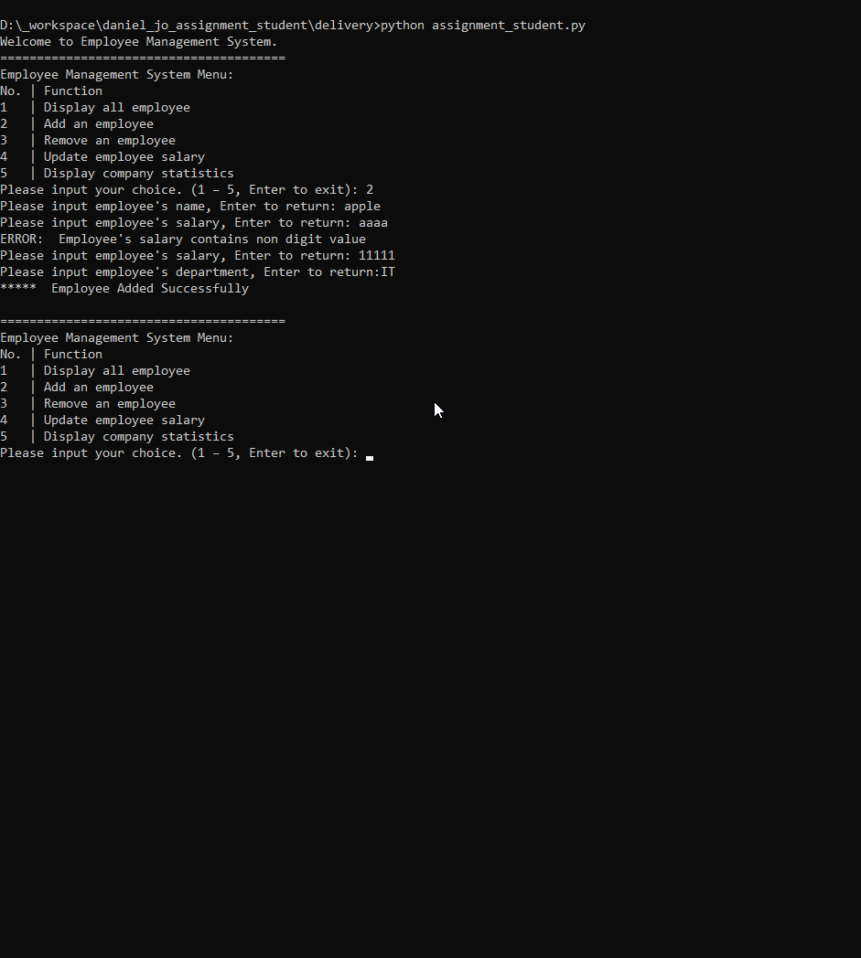 3. Input "aaaaa" for salary (invalid input as contains text)