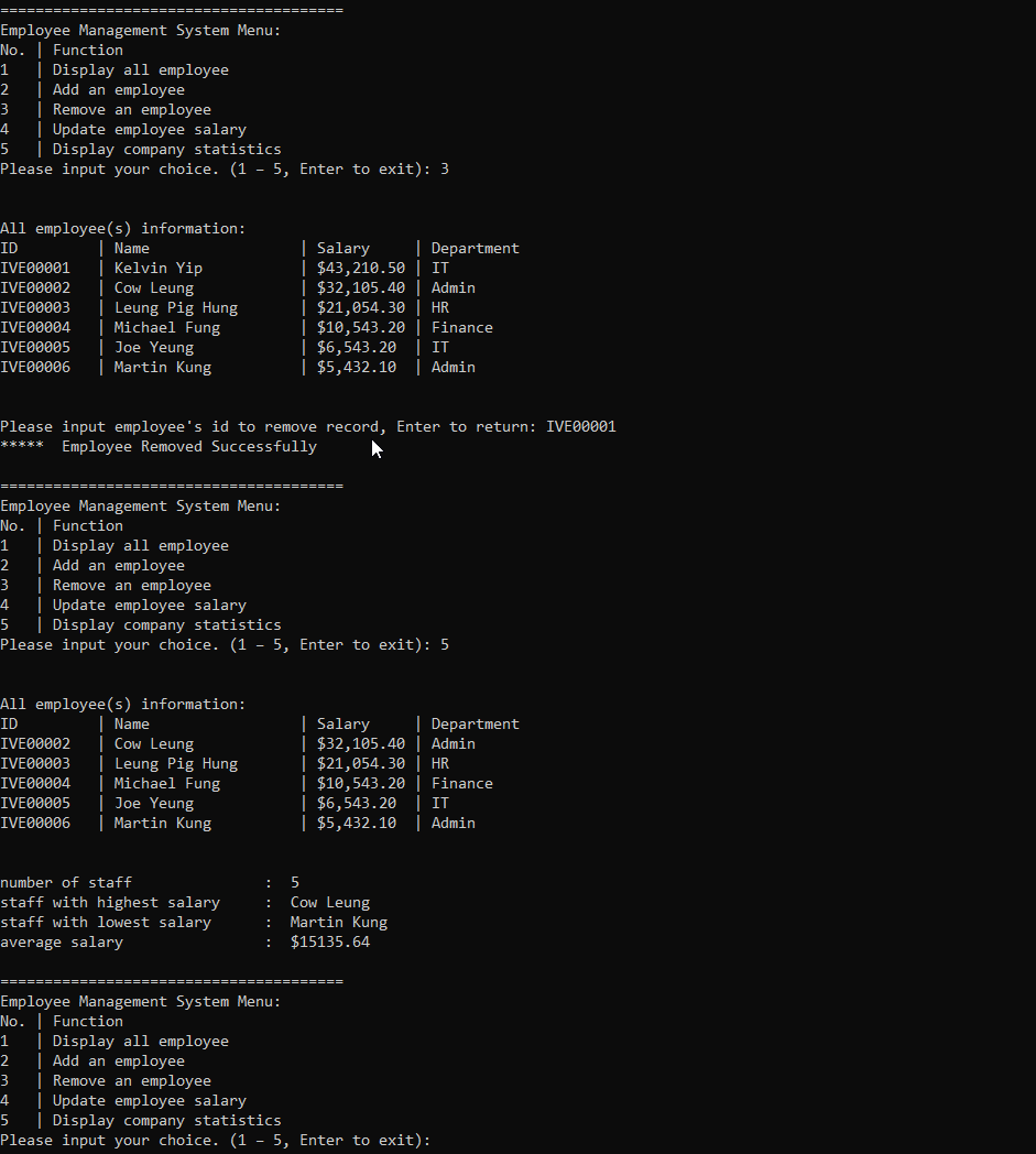 3. after getting valid id, show "* Employee Removed Successfully"