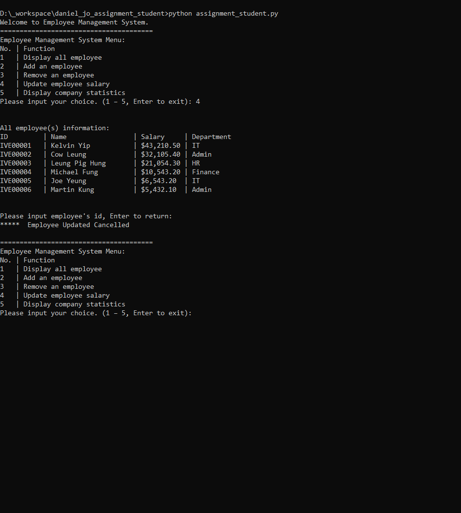 28 update employee (cancelling) 1. In the employee management system menu, input '4' to update an employee