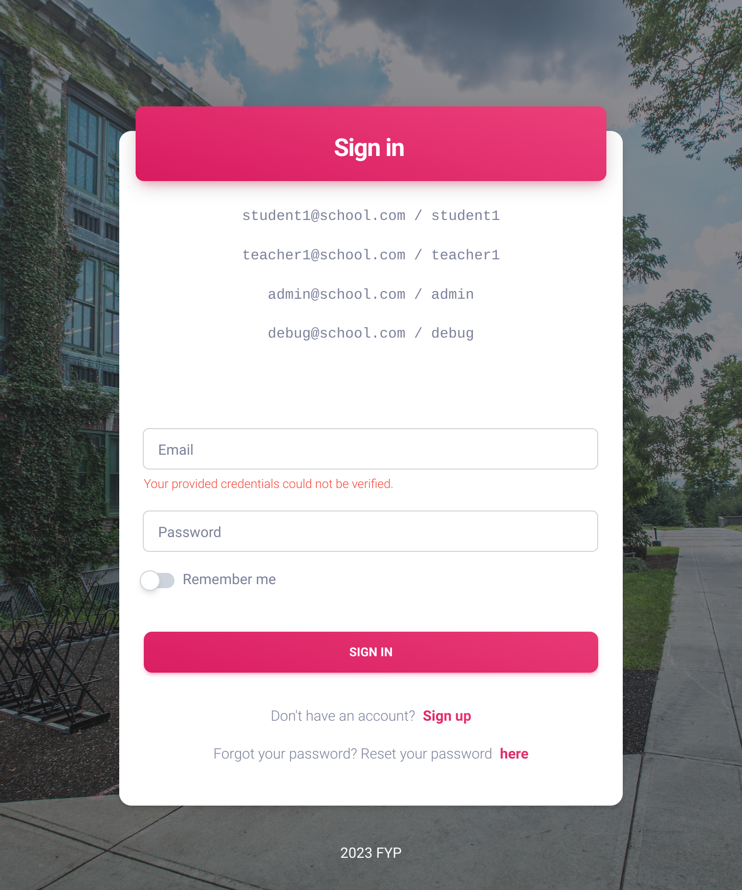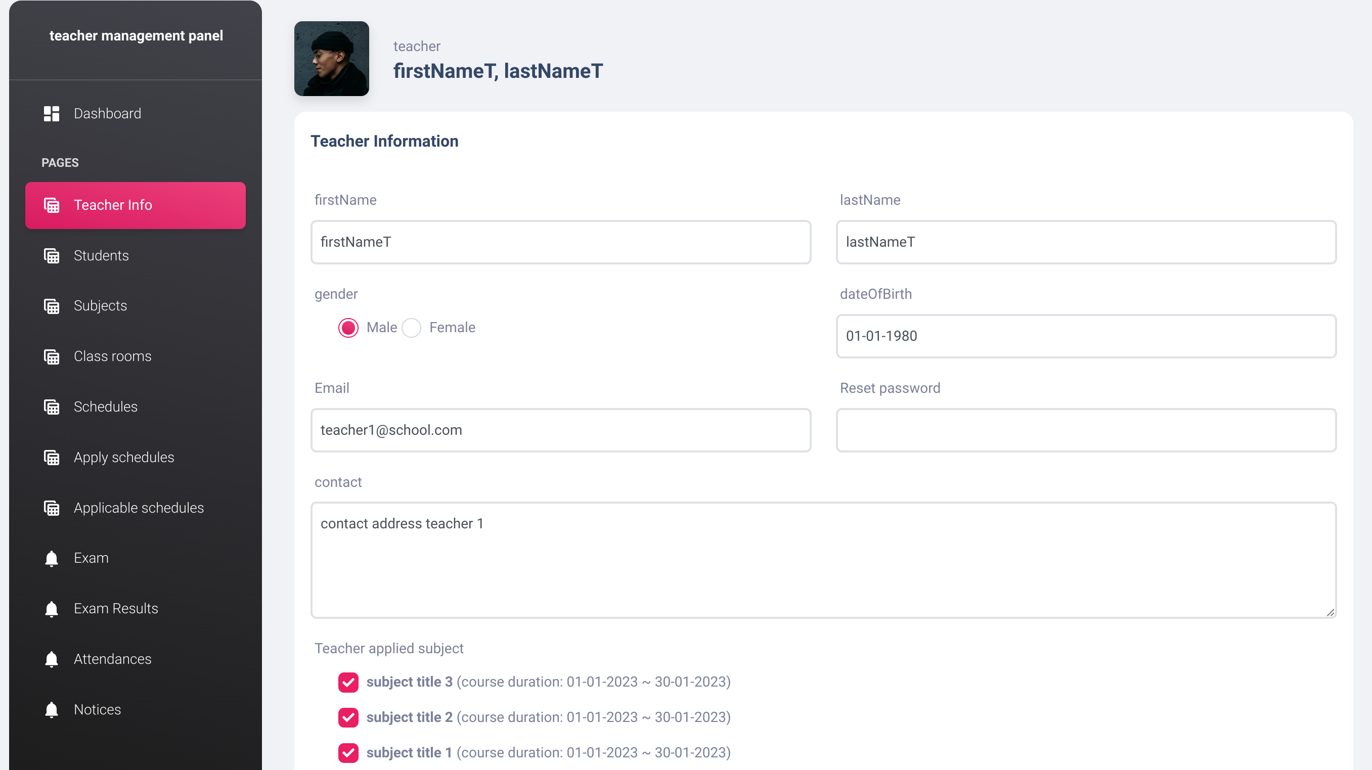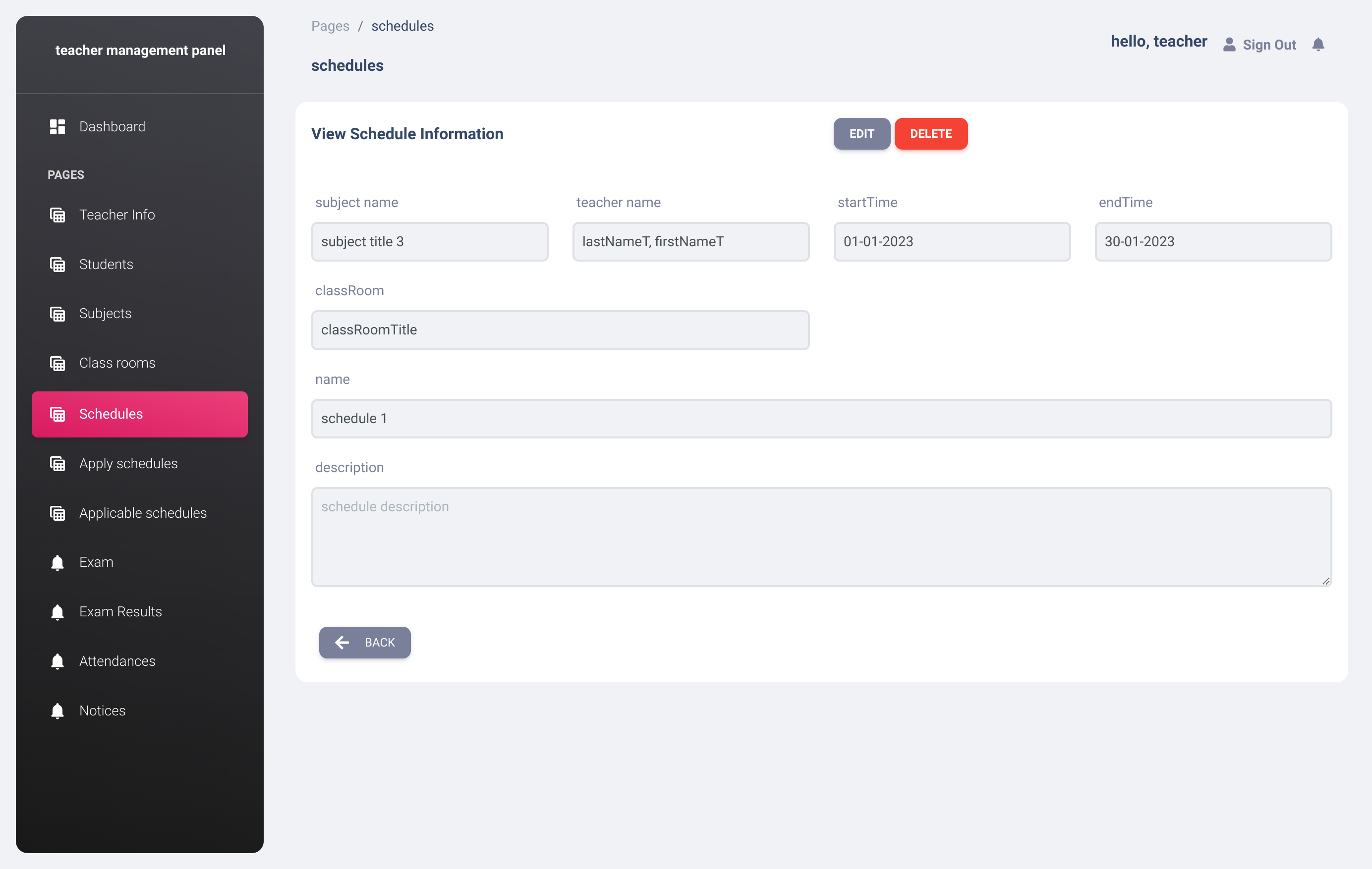 - schedule 想有 subject name, teacher name, classroom, day, start time and end time.