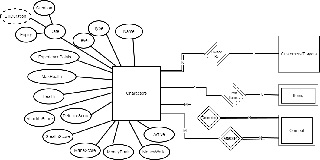 A Characters has a Name(key), Type, Level, ExperiencePoints, MaxHealth, Health, AttackInScore, DefenceScore, StealthScore, ManaScore, MoneyBank MoneyWallet attribute.