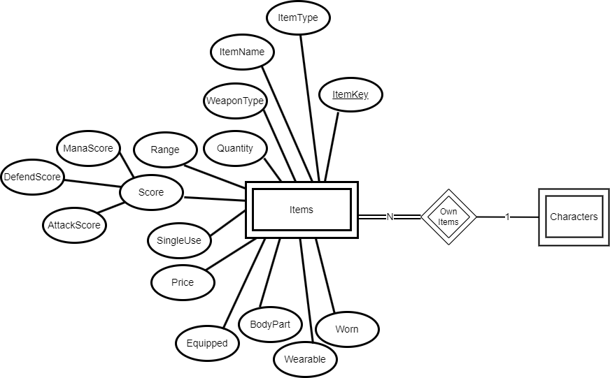 A Items has a ItemName, ItemType, WeaponType, Quantity, Range, SingleUse, Price, Equipped, BodyPart, Wearable, Worn attribute